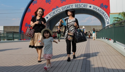 3歳の娘を連れて初めてディズニーランドに行ってきました 目の前に入口が見えてきて気持ちが先走り、足取りも軽くなったところをカメラに収めた写真です