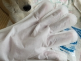 モニプラを通してペット用“ウェット手袋なでなで”を試させて頂きました(1袋1枚両面使い可能)ノンアルコール無香料なので舐めても安心!耳の汚れや細かい箇所もケアし易いという点が特徴早速開封してみます 両サイドに切り込みがあるので開封しやすく1袋に1枚手袋が折りたたんで入ってましたどんな感じなんだろうと手に装着してみるとあれ?濡れてない!!というのが正直な感想でした表面に湿り気がある事は取り出した時にわかっていたのですが内側も濡れてるかと思って居たらサラッとした感覚で驚きました(素材は外:レーヨンポリエステル 中:ポリプロピレン使用)今までにあったようでなかった両面使える手袋タイプ(どちらの手でもどちらの面でも大丈夫ってのが嬉しい!)準備が整った所でなでなでしながら実践してみると確かに肉球や指の間のケアはスムーズに行えますドテンと寝っ転がり手袋にまとわりつきながらじゃれ始めたさくら私の手だとちょっと大きくて手首の部分がビラビラして引っ張られましたが破れること無く丈夫な作りという事が判明それに手の平だけでなく手の甲部分も活用出来るのでかなり楽この1枚で拭き取れる目安体重は7kg以下と明記されてましたが12kgのさくらでも充分全身綺麗に拭き取ることが出来ました匂いに敏感な子でもこれは無香料なので気にならないし濡れることが苦手な子も不快感なくケア出来ると思いますちょっとサービスでマッサージ&じゃれあいタイム付きにしたのでかなり満足になったさくらなのでした(満足しない訳が無い!!)体も綺麗さっぱりして気持ちよくなった所で第2弾お昼寝タイムに突入となりました♪コジマ通信販売ファンコミュニティファンサイト参加中いつもありがとうございます にほんブログ村 人気ブログランキング 続きを見る ['close']
