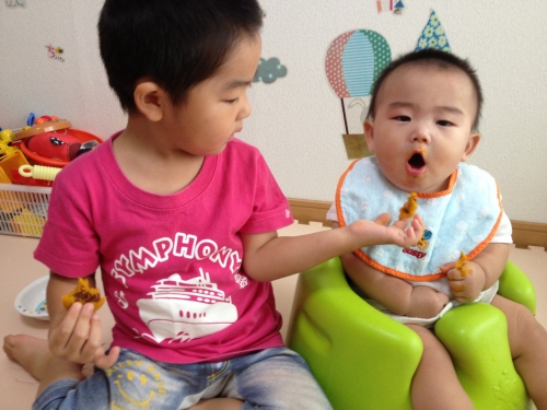 離乳食に作ったカボチャのおやきを、兄ちゃんが弟に食べさせてあげているところです これからも、なかよしな兄弟でいてほしいな