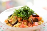 8月の下旬ですが、残暑厳しく口当たりのよい食事がおいしいです 今日、ご紹介するのは、旬のトマトと茄子をたっぷりと使った「トマトと茄子の冷製和風スパゲティ」です ソースは和風でさっぱりした味にし、トッピングには青じそをたっぷりつかいました スパゲティを冷たく冷やすこともおいしくする秘訣です!!★★★レシピ★★★<材料>(1人分)パスタ(スパゲティ)100gトマト中1個大葉5枚茄子中1本Aめんつゆ大さじ2Aみりん小さじ1A酢小さじ1A塩少々Aこしょう(ブラックペッパー)少々Aオリーブオイル大さじ1*その他麺を冷やす氷<作り方>スパゲティは塩少々を入れた湯で固めにゆで、冷水と氷でめんをしめてから、よく水けをよくきるトマトは皮をむき、2cm角くらいに切る大葉は細く切る茄子は厚さ5mmぐらいの半月切りにし、フライパンにオリーブオイル(分量外)を熱して炒め、冷ましておくボウルにA、トマト、茄子、スパゲティを入れて混ぜ合わせる器にできたパスタを盛りつけ、大葉を添える*スパゲティをゆでている間にトマトを切ったり、Aを混ぜ合わせたりします*冷水と氷で麺をしめる作業は手早くするのがこつです時間が経つと麺がのびてこしがなくなります レシピブログに参加中♪クリックしてね!by Mariko 人気ブログランキングへ