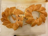 ベーコンとドライトマト、オリーブの入ったリースブレッド左がmilkro作先生のと比べると形が歪んでいる(";A でも味は大丈夫でした(当たり前か) 少しでもお料理をスキルアップできるように頑張ろうと思います