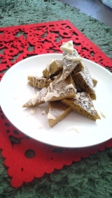 さて、今回もレシピ提案のモニターに当選しました!! 今回の素材は 三笠産業株式会社 便利野菜jpの 野菜の乾燥粉末の中でも 明日葉パウダーです これです(10g入り)ティースプーン一杯で1束分の野菜が取れる便利粉末! 非加熱なので、栄養や繊維がそのままで粉末になっているそうです 青臭い抹茶みたいな粉末(明日葉なのでそうだよね、) これは癖のあるものとぶつけないと、明日葉の風味が目立って 料理としておいしくない気がする かなりなめらかな粉末なので、お菓子作りに使えるかなー 合わせるのはホワイトチョコが良いかも と思い、作ってみた ◆クリスマスツリー風ケーキ◆ (材料) 卵3個 薄力粉45g 明日葉パウダー5g 砂糖60g デコレーション用 粉砂糖&ホワイトチョコ 作り方 ①薄力粉と明日葉パウダーは合わせてふるっておく ②卵をしっかり溶き、砂糖を加える ③湯煎にかけながら、電動ミキサーで泡立てる ④ひと肌程度に温まったら、湯煎から外し、さらに泡立てる ⑤リボン状の筋が出るほどしっかり泡だてたら、粉を45回に分けて加え その都度ゴムべらでしっかり混ぜる ⑥粉っぽさがなくなり、生地につやが出るまで大きく底からしっかり混ぜる!! (かさは半分くらいになりますが大丈夫) ⑦紙を敷いた17~23cm四方くらいの天板に流し込み、型を少し落として余分な気泡を抜く ⑧180℃のオーブンで20分ほど焼く(こげそうならアルミ箔を被せる) 焼き上がったら、20cm位の高さから落として、焼縮みを防ぐ 粗熱が取れたら上にラップをかけて乾燥を防ぐ ⑨紙をはずし、三角や細い三角に切り分け モミの木っぽくお皿に盛る ⑩溶かしたホワイトチョコをたっぷりかけ、粉砂糖&刻んだホワイトチョコ等で飾る ※ホワイトチョコは多めが美味いですお好みで生クリームを添えても 更にもう一品 ケーキを作ってみて、想像以上に明日葉が強力なので より癖のあるものとぶつけてみた 【エスニック明日葉ドレッシングソース】 (材料) 明日葉パウダー 5g ごま油 大匙2 レモン汁 大匙1 ナンプラー 大匙1 塩 少々 すりおろし生姜 お好み (作り方) 材料をすべて混ぜるだけ 今回はトマトしか冷蔵庫になかったので、、、 蒸した鶏肉やエビ、春雨などエスニックサラダに入っている 素材とは相性いいかもしれない 10g使い切りましたので、これにて終了 http//moniplajp/bl_rd/iid2101751035527212fd690fc/m5272e7a577e1d/k1/s0/ 続きを見る