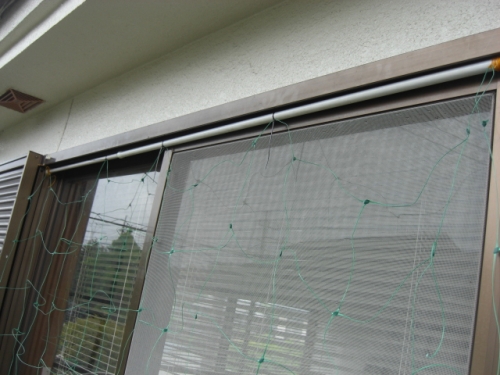 緑のカーテン作りにつっぱり棒使っています上部のネットをつっぱり棒で固定している感じですね皆さんにもオススメですよ♪