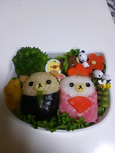 リラックマでお内裏様とお雛様作りましたリラックマはしょうゆご飯に海苔を巻いてますコリラックマはビアソーを巻いて着物にしました人参で桃の花をイメージしましたうずらの卵デキイロノトリ、ミートボールでハンバーガー作りました