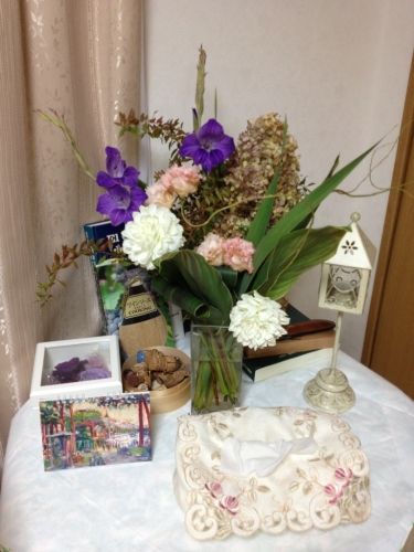 南仏の柔らかい明るい雰囲気が好きなので、リビングのコーナーに丸テーブルを置いて、お花や絵などを季節にあわせて変えて、明るい雰囲気を演出しています