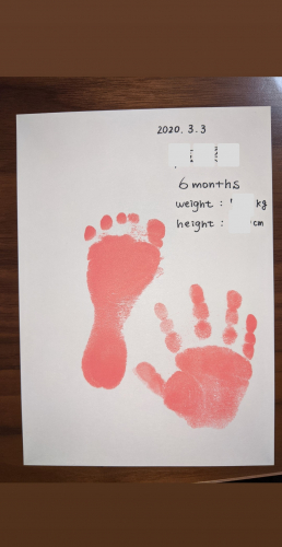 まず、説明書通りに大人1人が子ども抱っこし、別の大人1人があしがたをとりました次に少しインキパッドをずらしててがたをぺたり子どもが泣くことも嫌がることもなく、簡単に綺麗にとれました更に欲張ってもう1枚とれるかな?と家にあった別の用紙にぺたりとしたら、さすがに重なって押した部分のインクがかすれて綺麗にはとれませんでしたでも満足ですハーフバースデーのいい記念になりました …続きを見る ['close']