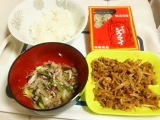 ご飯、シュウマイイカのアヒージョ、豚の味噌炒め
