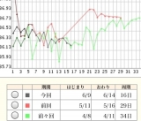 黒が今回ですが、先々月と似た感じですねあせる 先生が言うには、16日目が排卵とのこと…全然上がらないよー叫び