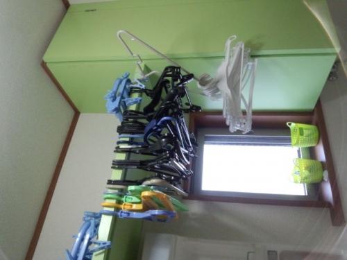 ハンガーをどうしてもかけて収納しかったので上の板にハンガーを掛けれる穴を作ってもらいました! 板の上にもあまり重たくないバケツなども置けます