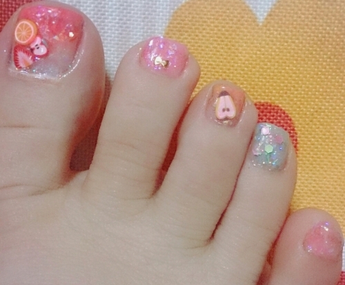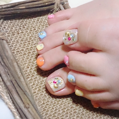 混色でパステルカラーを作り親指だけはキラッキラさせました! 中央に配置してる夏パーツがお気に入りです(´∀`)