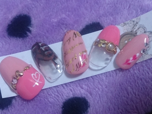 ピンク色のチョコレートをイメージしました お返しは薬指に指輪がもらえますように、と願をかけてリング風ネイル ものすごく乙女な色合いに仕上がりました