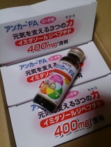 東海_健康COMさんのドリンク、アンカーFAを一ヶ月飲んでみましたアンカーFAというのは東海_健康COMさんの説明文をお借りすると…イミダゾールジペプチド業界最高「400mg」含有 清涼飲料水アンカーFA」は、鶏肉から抽出したイミダゾールジペプチド(アンセリンカルノシン)を高濃度に含む健康ドリンクです1本(50ml)には、イミダゾールジペプチド(アンセリンカルノシン)が400mg含まれ、さらに「ビタミンC」、「フェルラ酸」の3種類の成分が入っています「アンカーFA」は、チキンの味を感じさせないさわやかな酸味と甘さが特徴の果汁入り健康ドリンクです一本(50ml)でイミダゾールジペプチドを400mg摂取し、 しかも10kcalと低カロリーです【1本当たりの有効成分】 イミダゾールジペプチド(アンセリンカルノシン) : 400mg ビタミンC : 300mg フェルラ酸 : 20mg【原材料名】チキンエキス、エリスリトール、果糖、もも果汁、ビタミンC、酸味料、香料、フェルラ酸3種類の抗酸化成分を凝縮し、錆びないいつまでも活動的で若々しい体作りを支えますということなのです…!もちろん錆びないいつまでも若々しい体作りって言葉にやられたのはいうまでもありません独女だしね、いつまでも元気でいたいよねそれに疲れやすいとか目が疲れたーとかにもいいらしくてまるで私のためのドリンクのようでした30日分なのでたっぷり30本入り1箱10本入です同封のチラシにお値段も書いてありましたうはwwwなかなか手が出ないじゃないかピーチ味って書いてありますけれどもどっちかというと栄養ドリンクの味でした栄養ドリンクの味が若干ピーチよりとかそんな感じなのではないかと思いますモニター前はなんだか疲れやすいというか常に疲れた感じがするというかまあ年かなって思っていたのです朝起きたのに体が起きなかったり常に眠かったりこれはまあ体質?1月は風邪ひいてたりなんだりで体調はあんまりよろしくなかったんですけれども確かに疲れは残らなかった!!常にだるい感じがしてたのが体が軽い感じがしたんですそれに朝ちゃんと目が覚めるし夜眠いニートお昼になんもやってないと寝付けないじゃないですかそれでほぼほぼ逆転してたんですけどなんか戻りました布団入ったらすぐ眠れるしそして飲み終わってちょっとして昨日の夜は昼寝しすぎたせいか全然眠れなかったー!!けど今日は朝ちゃんと起きれたよ体も体重は重いけどそういう意味じゃなくて軽いよ!何より犬の散歩が億劫でなくなったのが嬉しいです犬が以前よりなついてくれてるせいもあるんですけどね最近はやたらわんわんといちゃらぶしてますよ←自慢今日は朝からだるくなかったので起きるなり郵便局いってきましたお待たせしました寒いけど完全防備じゃなくても大丈夫昨日の夜もニーハイにスカートでファミレスいってきたぜー!最近はコートも着ないでカーディガンで外出できちゃうのはこのドリンクのおかげなんでしょうか?昔はだっさいコート着てないと原付乗れなかったんだけど寒くて年とったのに寒さに強くなれる打なんて不思議このたびは素敵な機会をありがとうございましたANCARファンサイト参加中 続きを見る