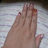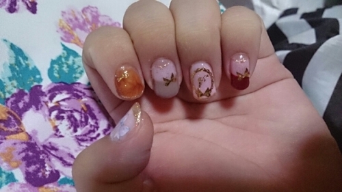 べっこうアートと秋カラー(ボルドーとシナモン)を入れつつもシックになりすぎないようにかわいいピンクを入れ、色をばらけさせたのでゴールドのアートで統一感を出しました