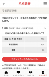 髪の悩みなんかでおなじみのリーブ21さんからアプリが出ていますその名も自宅でリーブttps//statamebajp/user_images/20191130/03/mizuchiyama/d3/95/j/o1026108014653985167jpg">まだお店に行くまでじゃないけど、気になる、そんな人でも気軽に試せる自宅でのホームケア用のアプリですカウンセラーさんからメッセージが届いたり、こちらから抜け毛を送って、毛根診断をしてもらったりすることができますまた最初に質問にいくつかと答えて危険度診断みたいなカルテも出してもらったのですが私は生活習慣がだいぶヤバい(笑)薄々分かってはいましたが生活習慣治すのって大変ですよねおいおいね、なおせていけたらねこんな感じで週に何回かメッセージが届きますそれから簡単なホームケアが実践できたかのチェックとかも出来るようになってます毎日入力系は極度の面倒くさがりの私はなかなか実践できないのですがマメな人にはすごく良さそうだなって思いました登録してしばらくしたら宅配便に毛根を送るセットと冊子が届きましたお風呂に入るときに抜けた毛を集めて18本ぐらい入れて、あとはポストに返送するだけ、そしたら、しばらくしたら毛根診断の結果が届きましたそれもアプリのメッセンジャーでお知らせが届きますアプリに毛根診断という項目があるので、そこからも簡単に見ることができますこんな感じで脱毛の原因を判断してくださいました18本送っても結果が六本分ということは、診断できる髪の毛がそんなになかったのかな?そして残念ながら私の抜け毛タイプは男性型のようです年々頭頂部が薄くなっていくなんて、そんな気はしていたんですええ、祖父は毛がありませんでしたその点については、女に生まれてよかったなぁと思っています男だったらもっとダイレクトに来ていると思うので(苦笑)ここから本格的に自宅でケアをしたかったら、アプリから本格的なサービスへのお申し込みもできます通ったりするのはちょっと大変っていう人にはすごいいいと思いますちなみにこの、自宅でリーブアプリの毛根診断とかできる、私が体験したプランは「髪ドック」といって、月額1000円で、初回は半額の500円で利用することができます向こうからもう毛根診断のセットとか送ってくるのでそれを考えたら格安だと思います診断した上でプランを変更したい時はアプリの中にプラン切り替えできるところがあるのでそこから申し込みもできますこれはもう本当に悩んでる人のガチのヘアケアが出来そうですお金持ちだったらやりたかったー!!通うのはちょっとって人でも自宅で出来たら手が出しやすいですよね気になったら覗いて見てくださいませ♡毛髪クリニックリーブ21ファンサイト参加中 続きを見る ['close']