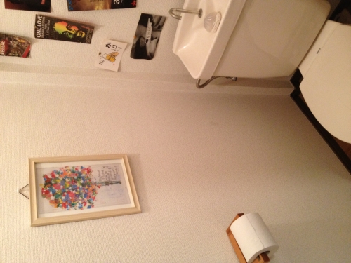 お気に入りの絵を飾り、私のホッと出来る空間です ペーパーホルダーや額縁を全て木で統一しています