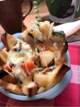 主婦のお昼ごはん事情〜 たま〜に 好きなものを買うなり 食べに行くなりする程度で 基本は前日の残り物だったり お弁当の残り物ってのが一般的ではないかしら? そんな私の今日のランチも前日の残り物〜 (ランチって言うと聞こえがいいかも〜♪) 昨日は肉じゃがでした! カレーと同じ材料なのに 肉じゃがとなると そんな食べない子ども達 ( ̄O ̄;)なんなの?一体 2日目カレーが美味しいように 2日目肉じゃがだって美味しいんだから!! って、強がってみたけど 同じ物を食べるのは飽きるのもホンネ そんな時は ちょっとリメイクで美味しく消費しちゃいます ♪( ´θ`)ノ またしても、コレをたら〜り♪ ホシサン★キムチ鍋の素 普段 子どもに合わせた食事で 辛いのが食べたいのに食べれない欲求を 1人ランチに注ぎ込みまぁ〜す(о´∀`о) ★まろやかキムチの肉じゃがキッシュ★ 〜お一人様分です〜 食パン8枚切り2枚を用意 うち1枚は バターを塗った耐熱皿にペタンと貼り付け 残り1枚は 対角線にカット→ズラさずそのまま十文字にカットして 小さな三角8等分にし 写真の様に間隔を少しズラしながら 太陽みたいに並べる そこに 残った肉じゃがを好きなだけ詰め込み あれば彩のニラなどをパラリ♪ たまご(1コ)と キムチ鍋の素 (小さじ2)を混ぜ合わせたものを上から全体に回しかけ とろけるチーズを表面に好きなだけパラリ♪ ⬇️ 時間短縮するために まず600W 2分30秒〜 3分ほどレンチンし チーズに焼き色を付けるために トースターでこんがりするまで焼く お好みでチリパウダーをパラっと♪ で、完成〜 残り物の肉じゃがが ちょっとオシャレにリメイクできたよっ♪ これなら 残り物感ゼ〜ロ〜! おなじ味に飽きちゃった〜なんて事なく 美味しく消費できます♪ チーズぴろ〜〜ん(о´∀`о) 周りのパンをプチっとちぎって〜 チーズのとこ乗っけて〜♪ カリトロウマァァァーーー(≧∀≦) 底の卵液が染みたパンもイケるぅぅーー (≧∀≦) キムチ鍋の素の辛味は たまごと合わせる事でマイルドになってるので これなら子どもでも大丈夫♪ キムチ鍋の素、 リメイクにもありですよっ♪ 肉じゃがの日は多めに作って 翌日 まろやかキムチキッシュしちゃって下さい (о´∀`о) 九州熊本の味噌醤油醸造元ホシサンファンサイト参加中 続きを見る