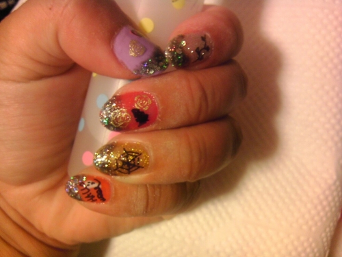 ラメでフレンチネイルにし、各指にコウモリや蜘蛛の巣、ゴーストにはハッピーハロウィンの文字、親指は隠れてしまいましたがお菓子、人差し指は箒に乗った魔女を手書きしました 北海道はあまりハロウィンの習慣が根付いていないのですが、仮装の変わりに指先を変身させてみました(笑) 子供たちに大好評で嬉しかっ …続きを見る