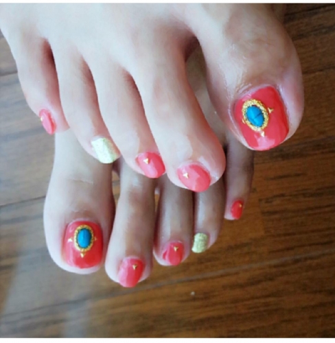 遠くからでもパッと目をひく鮮やかなフットネイルは夏らしいビジューパーツを付けて 娘にはパームツリーで夏の海をフットネイルに人気のホイルも貼りました♪