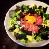 まぐろアボカド丼(^^)まぐろとアボカド、カイワレ、卵の黄身をのせて、海苔とゴマを、、、美味しくできました!【5名様プレゼント!】商品紹介ページに対するご意見でカレーもつ鍋セット