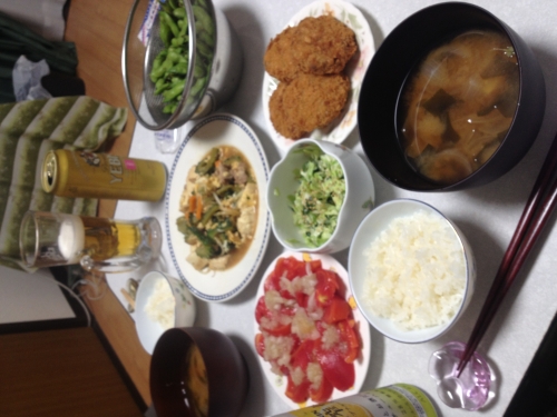 夏は終わりましたが、最後の足掻き‼笑 ゴーヤチャンプル、コロッケに 自家製のキャベツナムル、トマト玉ねぎドレッシングを作りました!