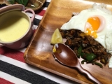 モンスーン風にガパオライスです! 味付けは、豆板醤、甜麺醤、オイスターソース、醤油です(^^)豆板醤は先に香りの野菜と炒めて辛味を引き立たせてください