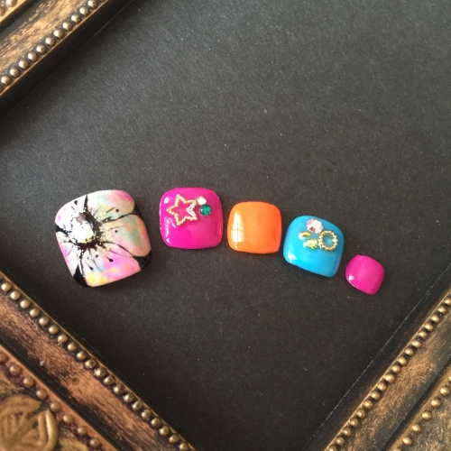 親指は大胆なお花を作って、他の指は明るいカラーで夏らしい感じにしました♡
