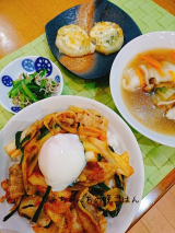 富士食品工業ファンサイト参加中こんばんは先週の晩御飯です豚キムチ丼山芋の青のりチーズ焼き水餃子入りスープ小松菜とちりめんの和え物富士食品工業様より、たくさんのモニター商品をいただきました「今日は俺が作ります!」より6種類のシリーズどれも美味しそうなのでどれから食べるか悩んでましたが着々といただいています豚キムチ丼そのなかから、「こくうま豚キムチ丼」豚バラ、ニラ、長ネギがあれば、簡単にできちゃいます1袋に、3食分が入っています私は、ニラと長ネギのほかに、新玉ねぎもいれましたあんまり辛いのは苦手なので、玉ねぎの甘味に助けてもらおうかと温泉卵も乗せましたこのシリーズを使ってみて思ったんですが、わりと味はしっかりしています丼ものとして食べてちょうどいいように、味は濃いめなので、裏面のレシピよりも、具材多めのほうが我が家にはあうようですそこまで辛くなく、私でも食べられるくらいです辛いのがお好みなら、一味など追加するといいかと思います富士食品工業株式会社山芋の青のりチーズ焼きちょっと甘めのおかずも用意山芋を輪切りにして、フライパンで焼き、青のりとチーズをかけましたシャキシャキとホコホコの触感がダブルで美味しいです水餃子入りスープ水餃子に、ニンジン、白菜、しめじ久しぶりに息子の好物こまつなとちりめんの和え物今、こどもたちがはまっていますwこどもたちには、豚キムチ丼は大人の味なので、こちらを「豚ばら生姜焼き丼の素」息子の晩御飯がこちらです生姜はよく香るのですが、食べてみると醤油のうまみのほうが強いので、味は普通に子供達でも食べやすいですただ、息子もこなつも丼ものより白ご飯派なので、別盛りですが1袋の調味料で2人分取れました生姜焼きだけど、ピーマンもいれてみたりお好きな野菜を追加していけそうです ←お手数ですが、応援いただけると励みになります 続きを見る ['close']