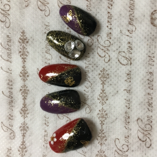 横向きになっててすいません和っぽい、着物に合いそうだと思います! 3Dやりたかったけど、筆がダメになってて 薬指のアクセントカラー?とポイントにVカットお気に入りです♪ 3枚目はネイル始めた頃に作ったものですこちらの2つはポリッシュです こちら3Dお花、黒 パール、ブリオン、斜め和ぽいでふかね? …続きを見る ['close']