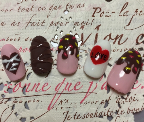 おいしそうなチョコネイルにしてみました♪愛を込めて赤いハートにLOVE♡