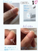 今回お試しするのはこちら!ドーン!!ビヨンドコスメBC ネイルセラムAED価格:2,600円(税抜)容量:33mlジェルネイルで傷めてしまったり、薄くなって割れやすい爪や、縦線が気になる爪にもってこい!!自分はどっちもです(´;ω;`)!さてまず結論から言わせて頂くと、想像以上に、目に見える効果あって驚きましたぁぁぁあ縦線が!!消えましてん!!まずは使用方法や詳細からー!こちらの商品は、ネイルメーカーのDearLaura(paとかみんな知ってるよね)と、バイオ研究所の代表さん(信頼感湧く)と、協力して作ったらしいですよ!!それぞれのプロが協力って、とてもワクワクしますな!!有効成分と、役割は以下の通り!この中の、「アミノ酸」が浸透の鍵本当にスーッと浸透するの!!不思議!!ってか爪角質層って何んなこたぁいい!!さて、早速、実際に使った所をっ(´∀`)!!「ボトル小さっ」とビビりますが、小さくてコロンとしたシンプルなボトルは可愛いです(´∀`)❤️がしかーしハケハケよこちらのセラムは「爪の裏側にもしっかり塗布」とあるのに、ハケが柔らかすぎて塗りづらいそこだけが不満さて、塗り方です個人的には、甘皮を押し上げた後、中にも押し込むように塗るといい気がしたあくまで「気がした」レベルですか、ご参考まで塗ってから完全に浸透するまでは、数分かかりますが、塗ったそばから浸透するんでびっくりしますよ1日2回、朝晩しっかり塗り塗りしますよーあ、ここからきったない爪が頻繁に出るんでご注意くださいまずは浸透の様子からー!!では!!ビフォーアフターいきます!!〈見て欲しい所〉①ビフォーでは割れてしまっている先端が、アフターでは同じ長さまで伸びても割れていない!!②こちらを塗り始めたと思わしき箇所から、縦線が消えた状態で爪が伸びてる!!ちなみに、手触りもキメ細かくなったかの様にスルスルシルキーな手触りちょっとマジですごいんだぜ正直「気休め程度だろ」と思ってました本当にすいませんでしたジェルネイルをお休み中の方や、痛みの気になる方は本当に是非!!単なる気休めなんかじゃない効果ありますわよ!!DearLauraファンサイト参加中 続きを見る ['close']
