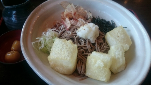 「冷やし揚げもちそば」 お餅の揚げた表面のカリカリ感と 中ののびーるやわらかいお餅がお蕎麦との相性がよく(´▽`) 上にのっている「ねぎかつおぶしのりだいこん」 そしてお好みで入れ余ったら持って帰れるわさび めんつゆとそばと混ぜて食べるともー最高においしかったです …続きを見る