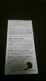 株式会社クリオス様のココナッツオイルプリングのモニターに当選しましたココナッツオイルプリングとは、ココナッツオイルでうがいをすることなのですが、健康や美容に効果があり、ミランダカー等も実践している美容法ですグアムに行き、ココナッツにどはまりした私は面白そうだなぁと思い、応募しました♪実際に試してみたので、その様子をレポートしたいと思いますパッケージはこんな感じで裏側に…説明が書いてありますちょっと小さくて読みづらいのでこちらを見ました♪一緒についてきた詳しい説明ですちなみに、ココナッツオイルプリングてどんな効果があるのか気になり、試す前に調べたら…効果口のトラブル、口臭予防口の中の細菌をココナッツオイルプディングすることで吸着し吐き出す事ができるので、虫歯や歯周病などの予防ができます♪口臭予防にも効果があります歯のホワイトニング効果続けて効果が出るようです歯磨きと併用して歯を白くしたいですね美容効果顔の表情筋が鍛えられ、ほうれい線が薄くなるとか顔全体が引き締められ小顔効果もあるそうですデトックス効果口の中にオイルを含むことによりオイルが体に浸透し、体内の毒素を排出してくれる働きがあるそうです毒素たまりまくりだからこれは嬉しい(笑)慢性的な疾患の改善便秘やPMSなどあらゆる疾患の改善が見込まれるみたいですデトックス効果からくるものかもしれませんねとあらゆる効果が私は美容効果とデトックス効果に期待して…Let's tryまず開けてみると…トロッとしたココナッツオイルがココナッツのいい香りがします(´∇`)♪説明にあったようにまずは水を飲みます唾液をよく出す為だそうです↓続いて、ココナッツオイルプリングを口に含みます口に入れたら唾液と混じり液状に↓このあと1020分間オイルを口の中で巡らせますこれが大変でした10分以上うがいをすることがこれだけきついとは…歯と歯の間にオイルを入れたり出したりして危うく飲んでしまいそうになるんです(笑)ところが細菌だらけなので飲んだらいけない…我慢我慢の時間でした慣れたら要領が分かりそうな感じですが、初めてでしたので頬は痛くなるし、飲みそうになるのを我慢して大変でした↓10分経ち、オイルを吐き出し口をすすぎます頬は鍛えられた感じがしましたね口の中はココナッツオイルの香りがふんわり残りました結論 続けてみないとはっきりした効果はわからないけど、口臭と美容効果は感じられました頬の筋肉が引き締められたのを1回使用しただけでも実感できたので、続けていくことでより目に見える効果があるのかなと感じましたココナッツ好きな私には飲み込まない努力も必要になるかなと思いました(笑)目に見える効果が出るまで続けてみたいです!!今回ココナッツオイルプリングのモニターをさせて頂いた株式会社クリオス様、モニプラファンブログ様ありがとうございました(^^)株式会社クリオスファンサイト参加中商品について詳しくはこちらです♪ 続きを見る ['close']