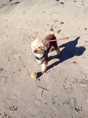 この日は砂浜でボールを追いかけたいい運動になります疲れ知らずのちゃろです 歯磨き上手にできなくて困っています