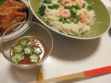 パッケージのオクラを使った盛り付けがかわいかったのでマネマネ小鉢のエビが余ったので素麺にオン