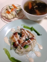 10/8 夕食記録&モニター記事①きゅうりのちくわのわさびマヨ②ワカメスープ③チキンリゾット風さっそく当選した商品でごはん作ってみましたー!↑贅沢に二つとも材料2人分ピエトロドレッシングスパドレきのこクリームオリーブオイルえのきごはん 250g鶏胸肉 100g塩胡椒茹でた小松菜①深皿にえのきとオリーブオイルガーリックを適量入れてレンジで1分チン②その間にチキンを切ってピエトロドレッシングにつけ置く③チン終わりのお皿にごはんを入れて混ぜる塩胡椒で味を整える④②に片栗粉をつけて両面をこんがりやく⑤お皿に③小松菜④の順に乗せてスパドレをかけたら完成ー!個人的には好きな味❤️醤油や大葉をつかっても合いそう!パパさんに…モコズキッチン!!言われてしまいました(>_ 続きを見る ['close']