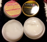 こんばんははじめましての方も、読んでくださっている方もお目にとめていただいてありがとうございます良いご縁を頂きまして、今回こちらの商品を試させて頂きましたこの2種類のクリームを左側は朝に、GOLDは夜の化粧水の後に使っているところです蓋を開けてみたのがこちらパッと見る限り、違いははっきりわかりませんがGOLDの方がテクスチャーがこっくりとろみが濃いように感じました朝に使用しているもっちり白肌クリームは、クリームなんだけどみずみずしいっていうのかな?すぅーっと馴染んでべたつかず、肌がもちもちして気持ち乾燥による悩みの頬の毛穴の開きもマシな気がします夜に使用しているGOLDクリームは、テクスチャーがとろんと濃いめですがこちらもまたみずみずしく肌馴染みも良くて、翌朝の肌がふっくらとしてハリがあるように感じますまだ使用している最中ですが、混合肌でインナードライで敏感肌な私の肌でなくなるまで使ってみようと思います私としてはエイジングケアも期待できそうなGOLDがおススメかなミックコスモ★ファンサイトファンサイト参加中最後まで読んでいただいてありがとうございます 続きを見る ['close']