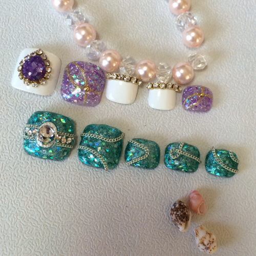 ド派手フットネイルを揃えましたじっくり観られることよりも、パッと目を引く大胆な色と大振りなデザインにしました夏ならではの私の楽しみ方です