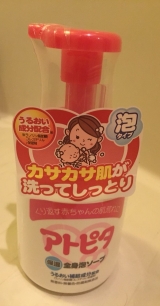 こんばんは今日二度目の更新です先日5ヶ月になったばかりの息子は、乳児湿疹が落ち着いた後も、寝返りでいつもほっぺたをこすってその部分だけ皮膚が赤くなってしまったり、指しゃぶりをするとすぐに口周りがかぶれてしまったりと、デリケートな肌質のようですそれから関節のシワなどには結構汗をかいて赤くなることが多いですそこで、ここ数日丹平製薬株式会社さんのアトピタ保湿全身泡ソープを試してみました!!パッケージはこんな感じです(^_^)ポンプを押す部分は少し広めで、片手に赤ちゃんを抱っこしていても、押しやすく、容器も倒れにくくなっています泡を出してみましたこんな感じでとってもきめ細やかでクリーミーな泡が出てきます今まで別の会社の泡ボディーソープを使っていたのですが、泡のクリーミーさが全然違いました!いつも手で息子の体に泡を広げて洗っているのですが、クリーミーな泡なので伸びも良いし、包み込んでくれる感じがします泡切れはよく、洗い上がりもヌルヌルしないし、つっぱることも無いし、ちょうど良い感じですここ数日使ってみて、関節のシワの赤みはなくなりましたアトピタシリーズはUVクリームも使っていますが、無香料無着色防腐剤無添加アレルギーテスト済みと、お肌に優しく安心して使えます使い切ったらまたリピートしようと思います 続きを見る ['close']