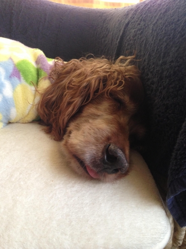 毛布にくるまってベロ出しして爆睡中! 大型犬なのでソファを占領してます