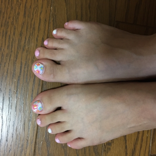 白地にピンクと青のお花です! 親指以外は単色ネイル 筆の質感がお花の花びらにぴったりです アバウトに書いてカジュアルな感じにしました!