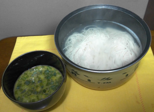 釜揚げうどんの素麺版みたいなものです ゆでたて熱々の素麺を薬味を入れためんつゆや生卵で食べます 食欲がない時や胃腸の調子が悪くても、これなかするするっと食べられます 温かいので寒い時でも大丈夫です