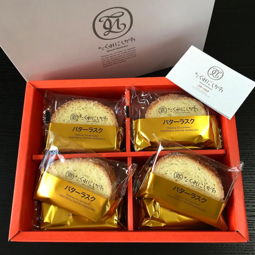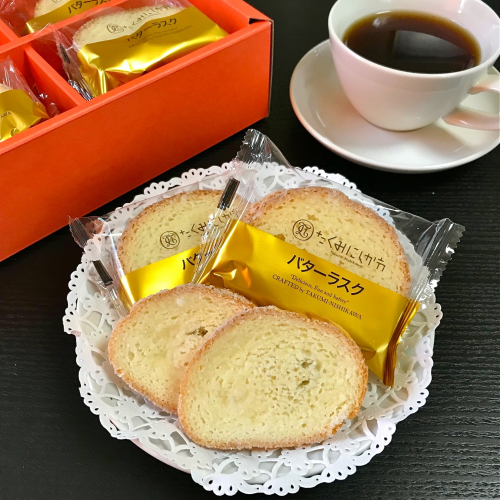 【おとりよせネット】”たくみにしかわ”さんのバターラスクを ティータイムにいただいてみました! ゴールドのラインの入った、とてもお洒落なパッケージの中には、 カリカリに焼き上げられたラスクが2枚 ラスクと言うとカリカリの歯ごたえがある食感のものが多い中で、 このバターラスクはサクッとした軽やかな食感で、 ふんわりとお口の中で溶けるような繊細な感覚のラスクで 香ばしい小麦とバターの香り ラスクにまぶしてあるお砂糖のまろやかな甘さが心地よく もうひとつ、もうひとつ…と、ついつい手が出ちゃうくらい美味しかったです それもそのはず! 美瑛産の最高級小麦、甜菜糖に天然のミネラル塩、 ラスク専用のフランスパンという厳選素材と、 こだわりの製法によって焼き上げられた匠の技による究極のラスクで パッケージもお洒落で高級感を感じるもので贈り物としても喜ばれること間違いなし 自信をもってお薦めしたい逸品です 続きを見る