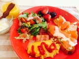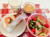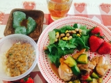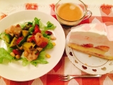 ヨガの瞑想コースに参加し、ランチはコブサラダのサンドイッチ、蜂蜜のマドレーヌ、苺とコーヒーでした