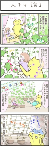 こんにちは、猫子ですヘチマカーテンのお話です5html">ヘチマカーテンを作ろう!①種まき編ヘチマカーテンを作ろう!②ネット設置編4月にふーちゃんと種をまき、楽しく育ててきたヘチマ西日が目に染みます…(;ω;)うぉぉ花を咲かせる大事な時期に水をきらしてしまい、再起不能にこの時期夕立も多かったんで油断してました…ごめんよヘチマ…!あーータワシ作りたかったなぁぴぇぇ初めてのグリーンカーテンの感想成長が楽しいなんといってもこれです!毎朝、カーテンを開けるのが楽しみになりました成長が早く、1日5cmくらいニョキニョキ伸びてたと思います一番成長した株は2階のベランダまで届きました誘引が面倒くさい放っとくと上に上に伸びるので、カーテンにするために、横に向かわせたり、摘心をして脇芽を増やしたりしますこの作業、うまくいったときは楽しいです!しかし如何せん成長が早いので、ちょっとさぼると手の届かないところまで伸びてしまって、ほどく→横へ向かわせるが面倒でした暑いし早起きすればいいんだけど…水切れが心配で家をあけにくい旅行に行きたい人には向いてないな〜とつくづく感じましたそもそも鉢が小さめだったのも敗因です花壇の地植えの花たちは無事だったので、地植えだったら平気だったのかなぁ…ああ…残暑の西日どーしよう…ご近所のわさわさのグリーンカーテンが羨ましい…妬ましい笑オーニング買おうかなぁ〜〜(^q^)肌の健康を応援!ネオナチュラルファンサイト参加中 応援クリックお願いしますLINEスタンプ発売中! 親子にゃんこの日常 By にゃざっく 続きを見る ['close']