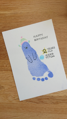 足形が指紋まで綺麗にとれて感動です 自分で足形をとろうとすると、準備が大変なのですが、こちらは煩わしい準備も片付けもなく簡単に、しかも綺麗に形がとれ、大満足です 足形アートを加えて可愛くさせていただきました! 記念の1品になりました