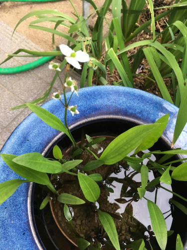 庭の火鉢ですずっと使ってなかったので水草とメダカを入れて使用しています可愛い白い花が咲きました