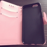派手すぎないピンク色で、手帳型になっていて、中にカード入れが2つついています!!手触りもいいです!!