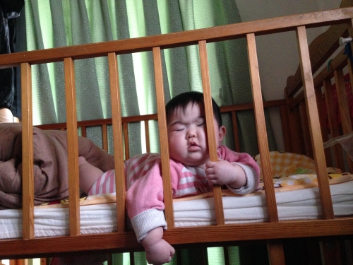早起きした娘は、いつもベビーベッドの中で暴れて私を起こそうとしますが、いつまでたっても起きないので、疲れたー…と一休みしてるところです