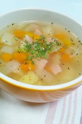 お野菜たっぷりコンソメスープ しじみのお味噌汁 梅とキノコ入りのおかゆ 飲み過ぎた時、風邪を引いた時にぴったりのメニューです