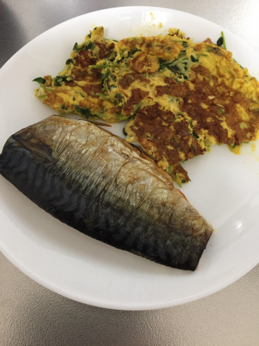休みの日はゆっくり起きてブランチ! 豆苗オムレツと塩サバ食べて元気に行ってきまーす